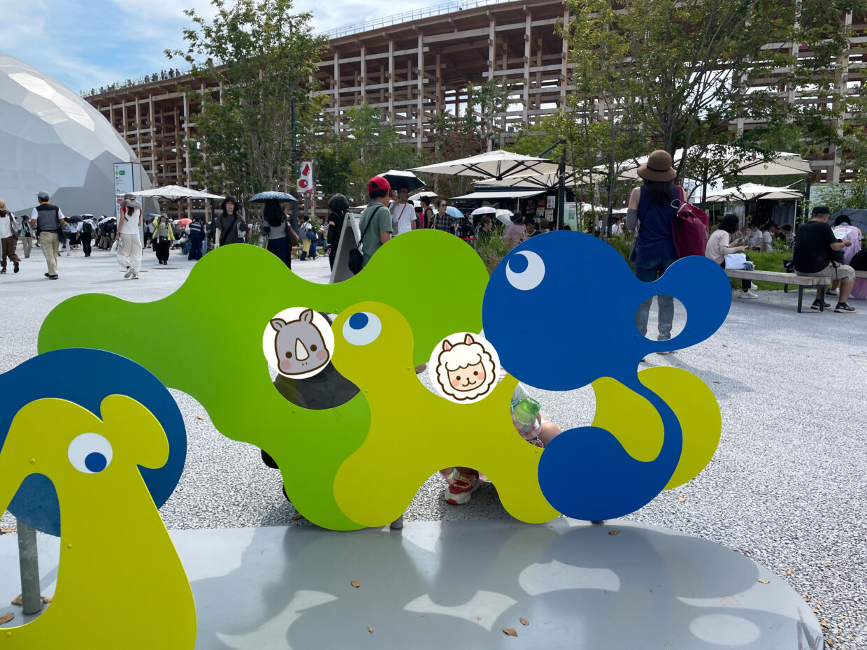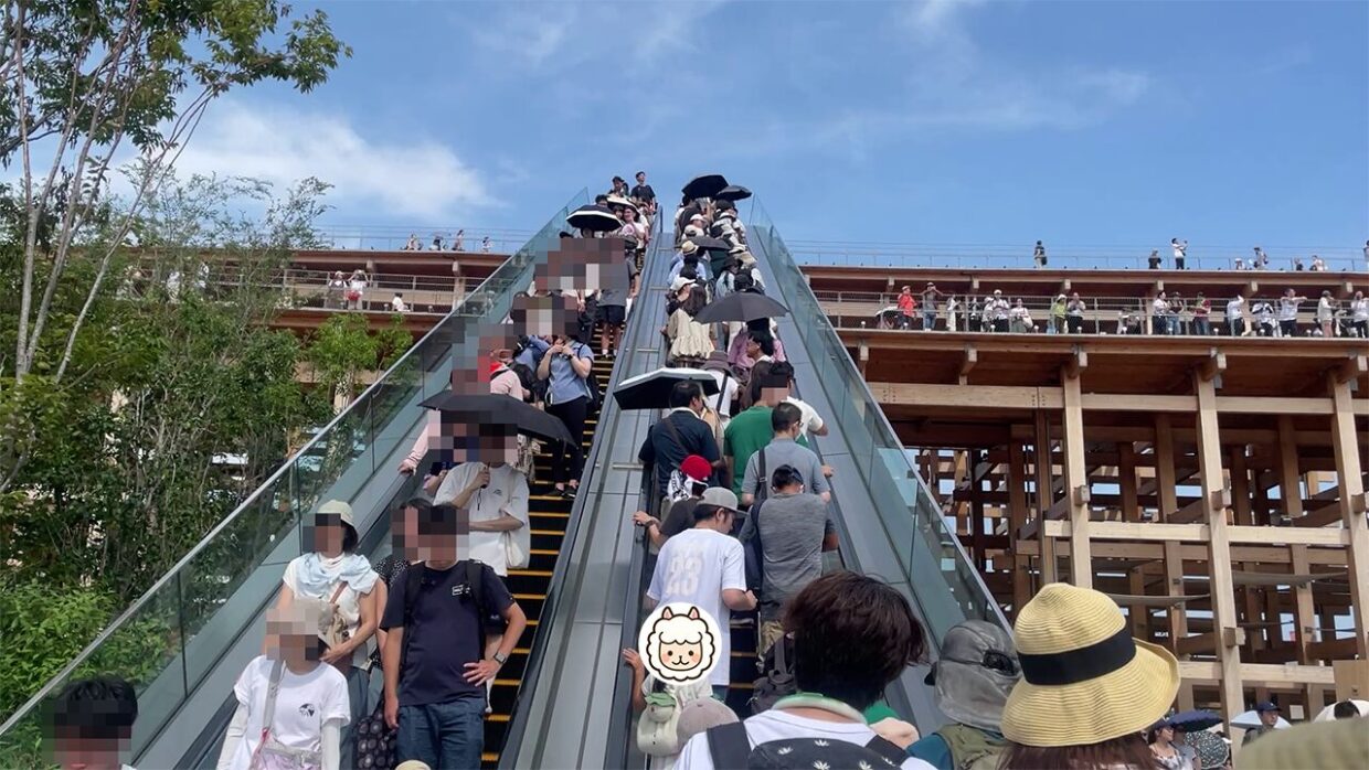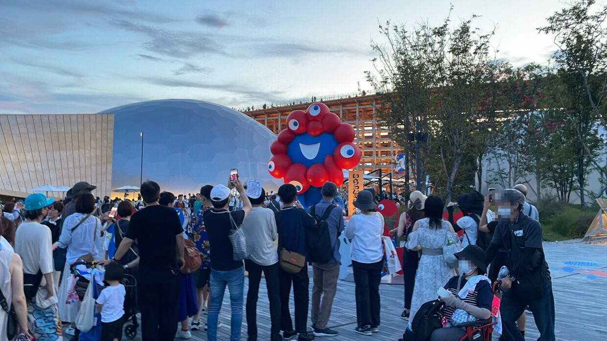 降りきると、そこにはミャクミャクのモニュメントをバックに記念撮影をする人だかりが。