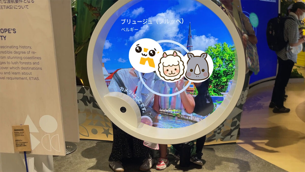 ヨーロッパの街並みを背景に記念撮影ができる撮影機があって、みんなで海外旅行気分♪