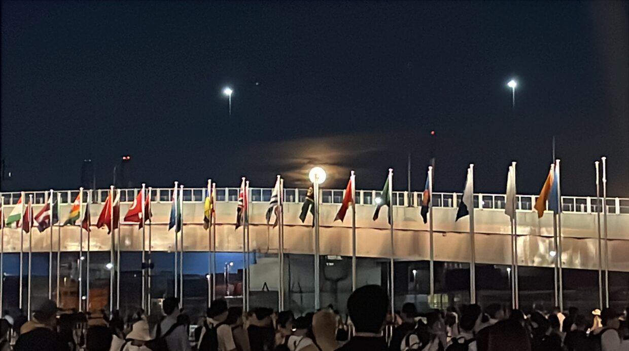 東ゲートに並ぶ各国の国旗の真上に、まばゆい満月が輝いていました。