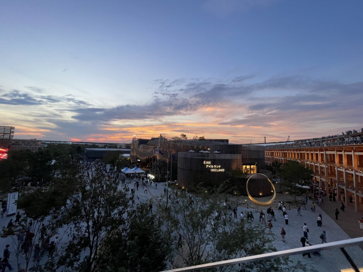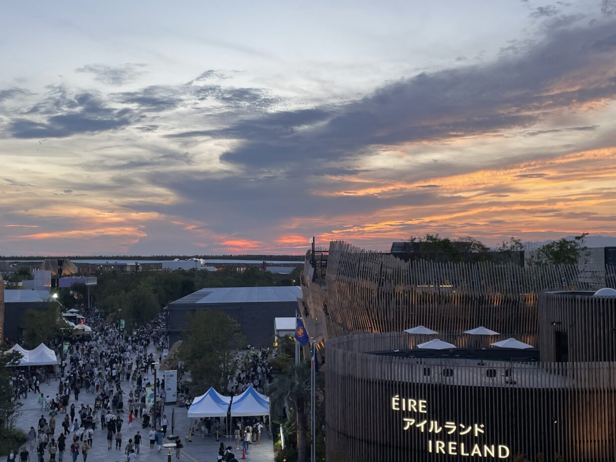 アイルランド館を背景に広がる夕焼けの大パノラマは、息をのむほどの美しさ。