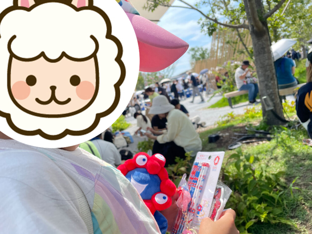アルパカちゃんは、もふもふした可愛いミャクミャク人形と、文房具グッズで大満足。